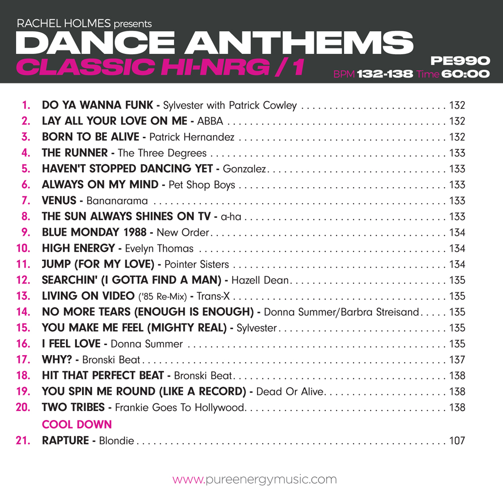 Dance Anthems – Classic Hi-NRG 1 rises in tempo from 132 to 138 BPM, making it suitable for Dance, Active Seniors, Step, Cardio, Lo Impact and Themed Classes.