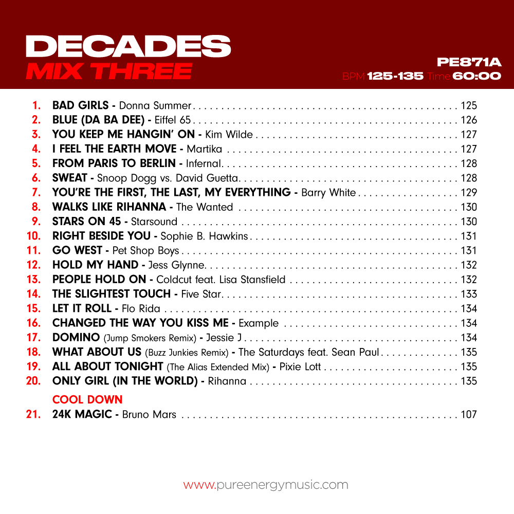 | 22 | Decades Mix 3 (Continuous Mix) | Pure Energy | 125-135 | 1:04:30 |