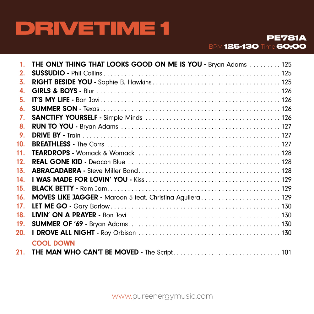 Drivetime 1 brings you 21 classic feel-good chart songs that you will know and love to sing along to as you work out.