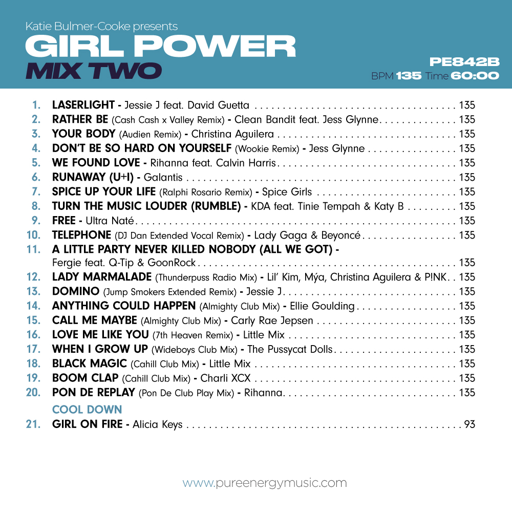 Running at a constant 135bpm, Girl Power 2 is ideal for Step, Aqua, Body Conditioning and Dance classes.