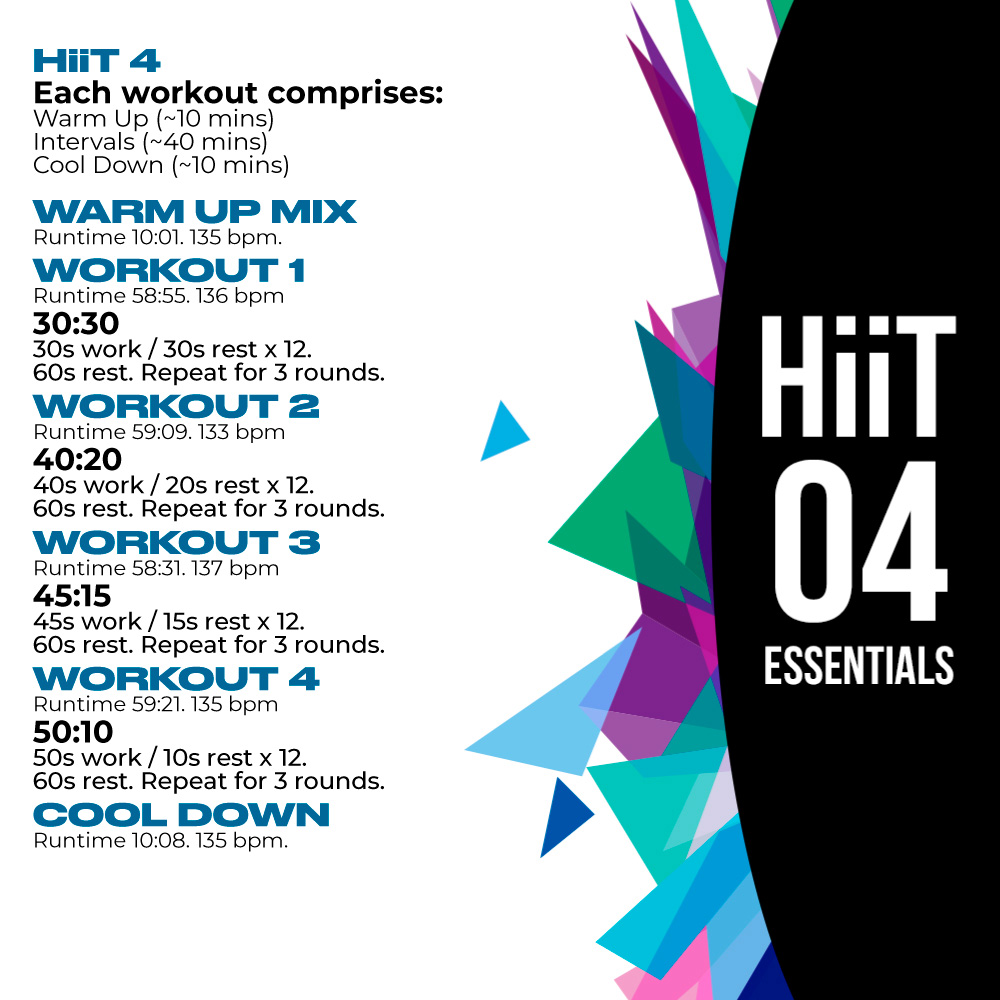 This version of HiiT 4 includes warm up and cool downs on each section, providing you with almost 4 hours of music. For an alternate version without warm up and cool downs, please check out HiiT 4B. Each section downloads as a separate MP3 to your device allowing you to select which ones to use in your session.