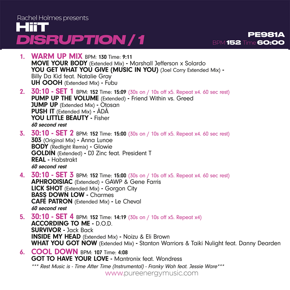 HiiT Disruption 1 consists of 4 protocols of 30 seconds of work with 10 seconds of recovery in 15 minute total blocks featuring tracks from known artists.