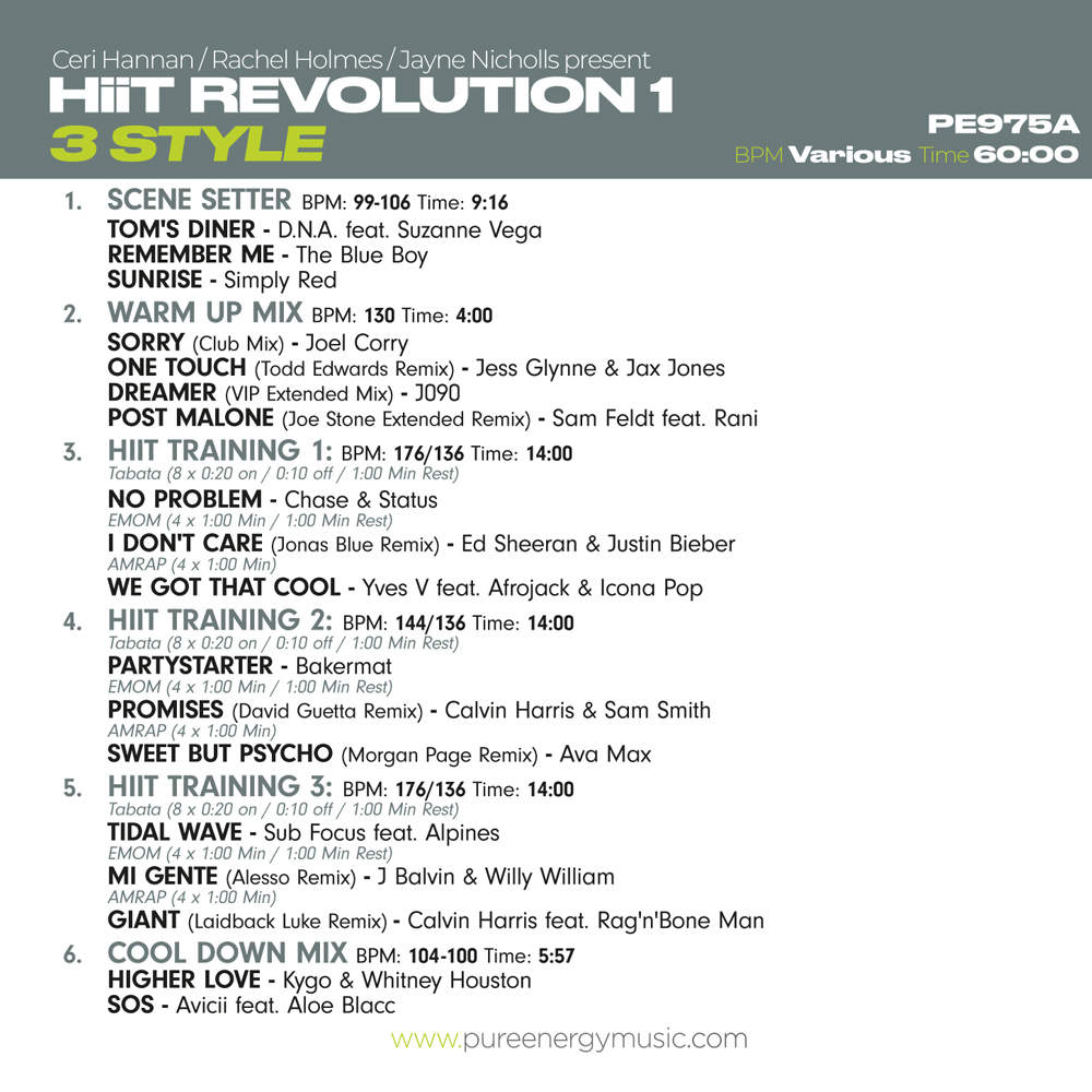 | 6 | HiiT Revolution 1: 3 Style - Cool Down Mix | Pure Energy | 104-100 | 5:58 |