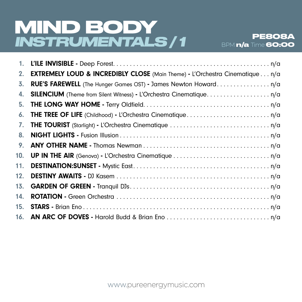 | 17 | Mind Body Instrumentals 1 (Continuous Mix) | Pure Energy | n/a | 1:00:01 |