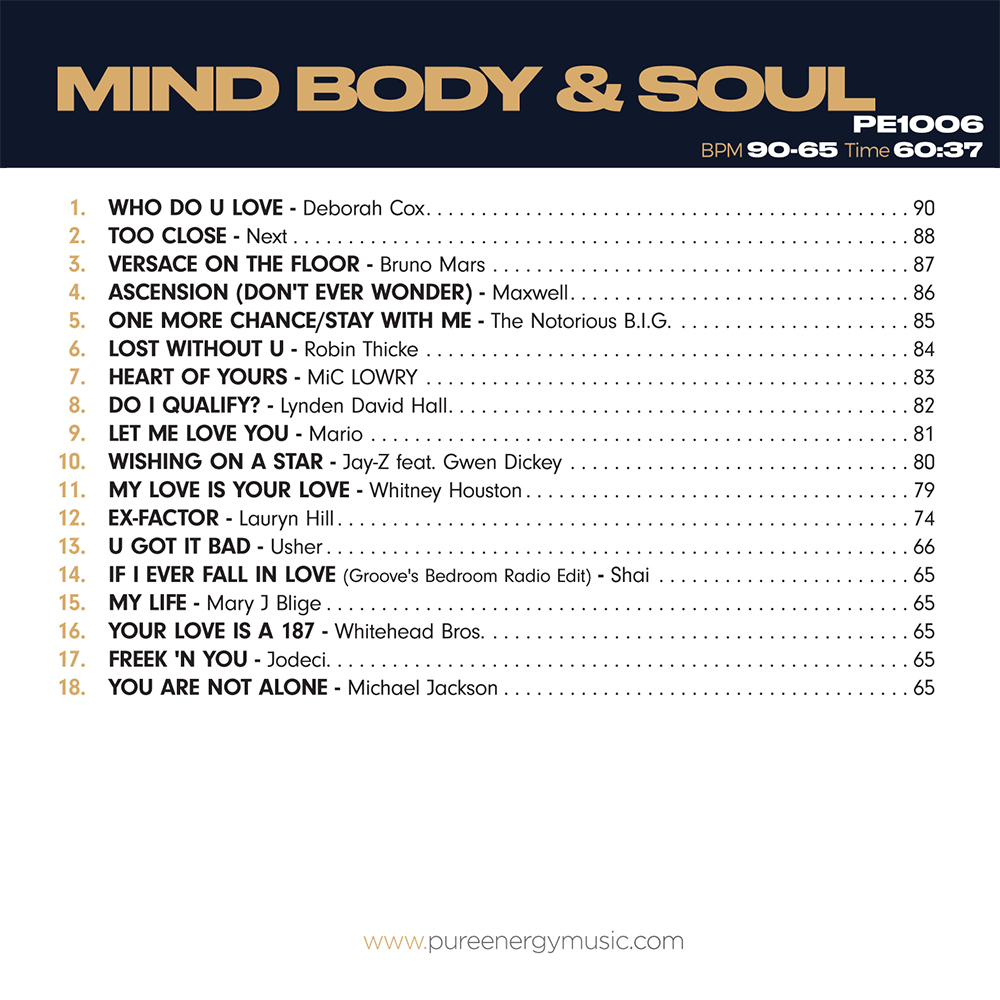 | 19 | Mind Body & Soul (Continuous Mix) | Various Artists | 90-65 | 1:00:38 |