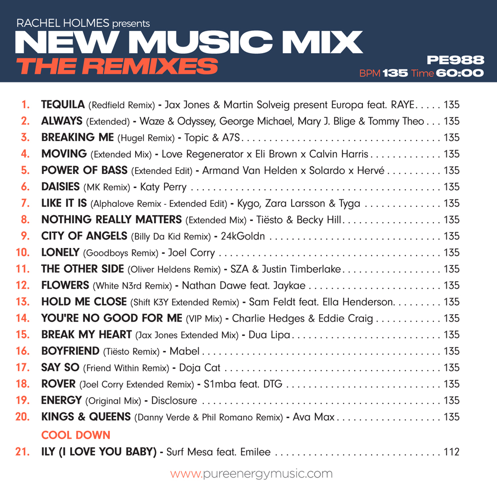 New Music Mix: The Remixes is a motivating mix of current favourites and upfront tracks opening with ‘Tequila (Redfield Remix)‘ and including tracks from Tiësto, Dua Lipa, Armand Van Helden, Calvin Harris and Joel Corry.