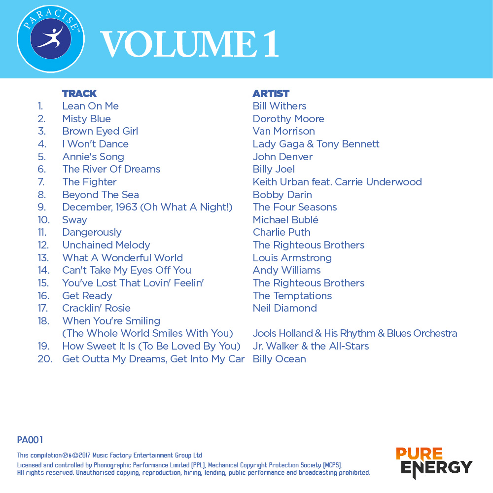 Paracise Volume 1 is available to licensed Paracise instructors. Please visit www.paracise.com for more information. This album features original artist music, meaning you must have the appropriate music licences in place to play it in public or online.