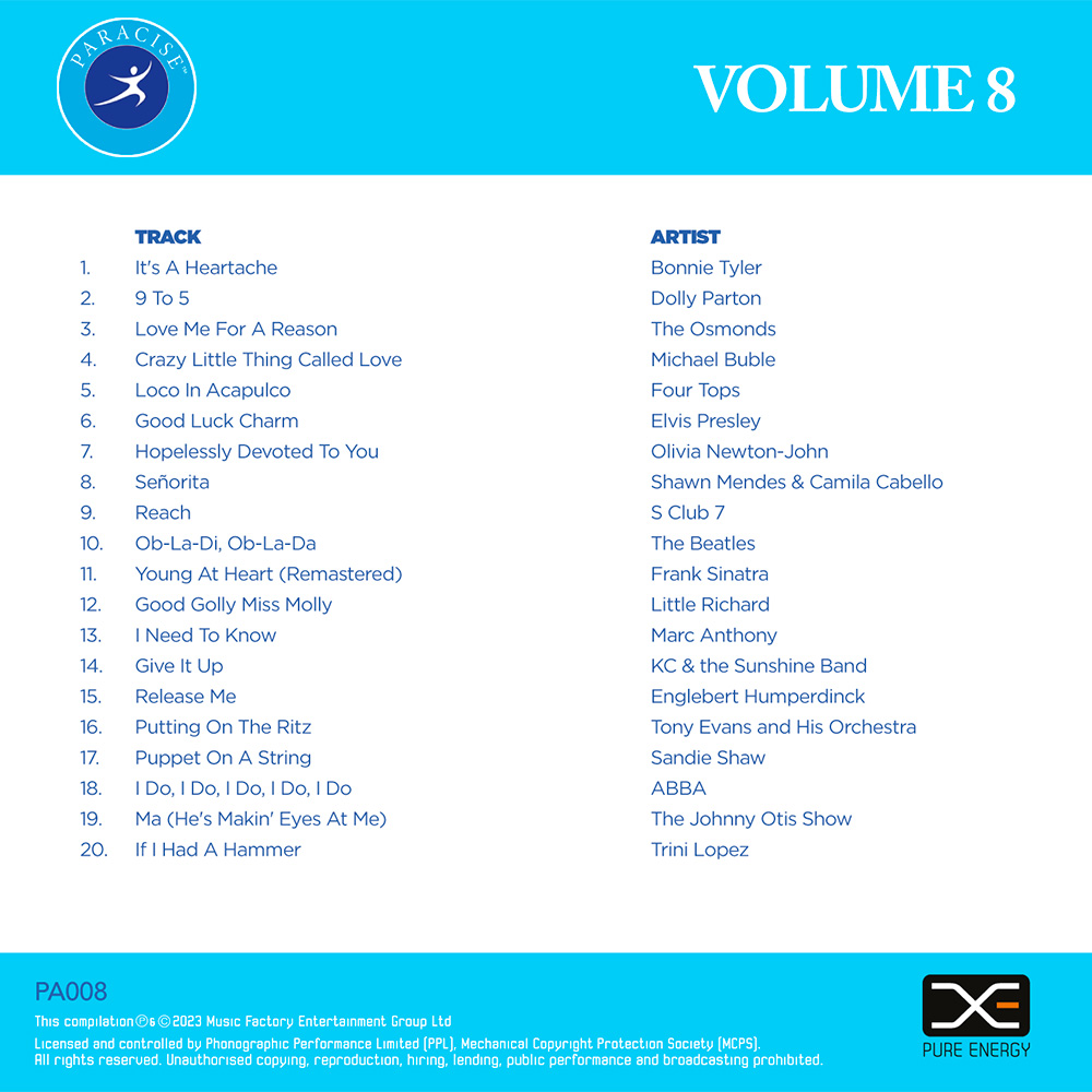 Paracise Volume 8 is available to licensed Paracise instructors. Please visit www.paracise.com for more information. This album features original artist music, meaning you must have the appropriate music licences in place to play it in public or online. is available to licensed Paracise instructors. Please visit www.paracise.com for more information. This album features original artist music, meaning you must have the appropriate music licences in place to play it in public or online.
