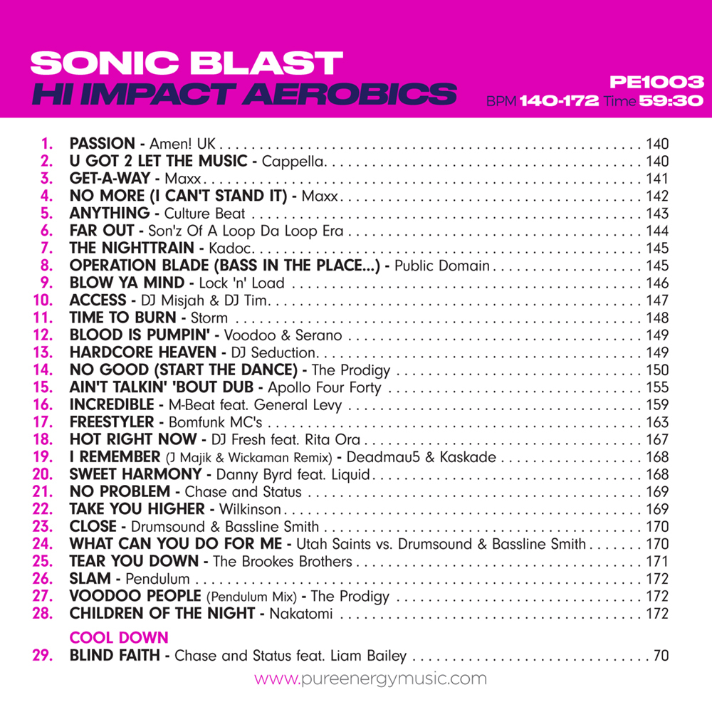 Sonic Blast: Hi Impact Aerobics starts at an upbeat 140 BPM and rises to 172 BPM with the perfect aerobic curve to drive your session to the end, featuring hits from artists such as The Prodigy, Bomfunk MC’s, DJ Fresh feat. Rita Ora, Chase & Status and Pendulum!