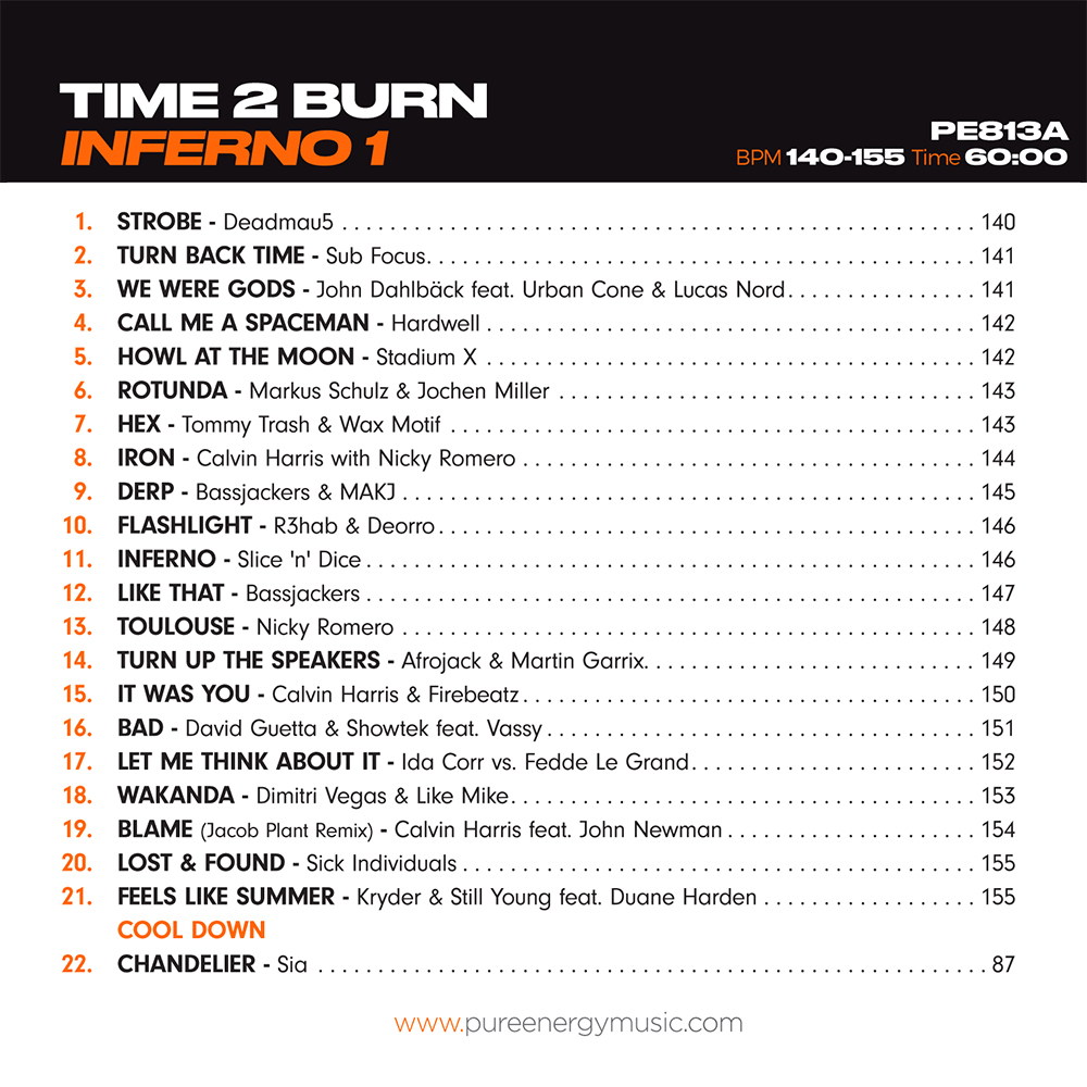 This album is taken from the back catalogue Pure Energy Time 2 Burn: Inferno double album release, and it contains original artist music, meaning you must have the appropriate music licences in place to play it in public or online.