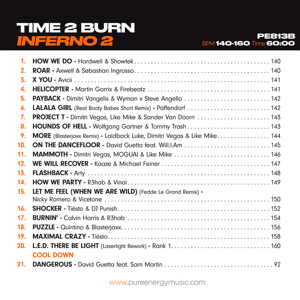 This album is taken from the back catalogue Pure Energy Time 2 Burn: Inferno double album release, and it contains original artist music, meaning you must have the appropriate music licences in place to play it in public or online.