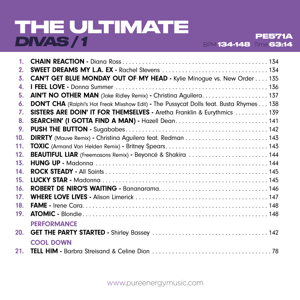 | 22 | Ultimate Divas 1 (Continuous Mix) | Pure Energy | 134-148 | 1:03:14 |