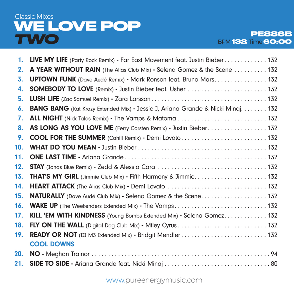 We Love Pop 2 is set at a constant 132 BPM making it ideal for Step, Aqua, Conditioning and other Cardio workouts.